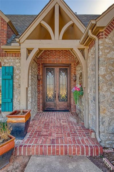 Welcome to this exceptional, one-of-a-kind residence in the secure gated community of the R&R addition nestled in Elk City. This stone French Country home stands out providing craftsmanship, warmth and a unique floorpan. Find yourself in a residence where craftsmanship, warmth and luxury comes together seamlessly. Located on a beautifully maintained lot, this impressive home offers striking curb appeal with its stone faade, charming architectural details, and inviting front entry. Step inside to a grand foyer featuring rich wood flooring, custom iron-accented double doors and an elegant chandelier that sets the tone for the rest of the home. Just beyond, you'll find thoughtfully designed living spaces filled with natural light, soaring ceilings and exposed wood beams that add character and sophistication. The heart of the home is the chef's kitchen and dining area, complete with extensive custom cabinetry, granite countertops, designer backsplash and hardware and high-end appliances. The spacious layout is perfect for entertaining, highlighted by a dramatic statement chandelier and stylish black-and-white tile flooring that creates a bold, upscale look. The living room is warm and inviting, featuring a beautiful fireplace, built-in cabinetry, and large windows with plantation shutters. Soft, neutral tones paired with elegant textures create a cozy yet refined atmosphere-ideal for relaxing or hosting guests. This spacious oasis comes with 4 grand bedrooms, including one with large windows that can be used as an office space or simply to admire the scenery. Throughout the home, you'll find curated finishes, including custom woodwork, upscale lighting, and unique design elements that make every space feel special. Outside, enjoy the serenity of a well-manicured yard with mature landscaping and plenty of space to relax. Included is a home generator and storm shelter.This home is truly a rare find-offering luxury, comfort, and timeless style in every detail.