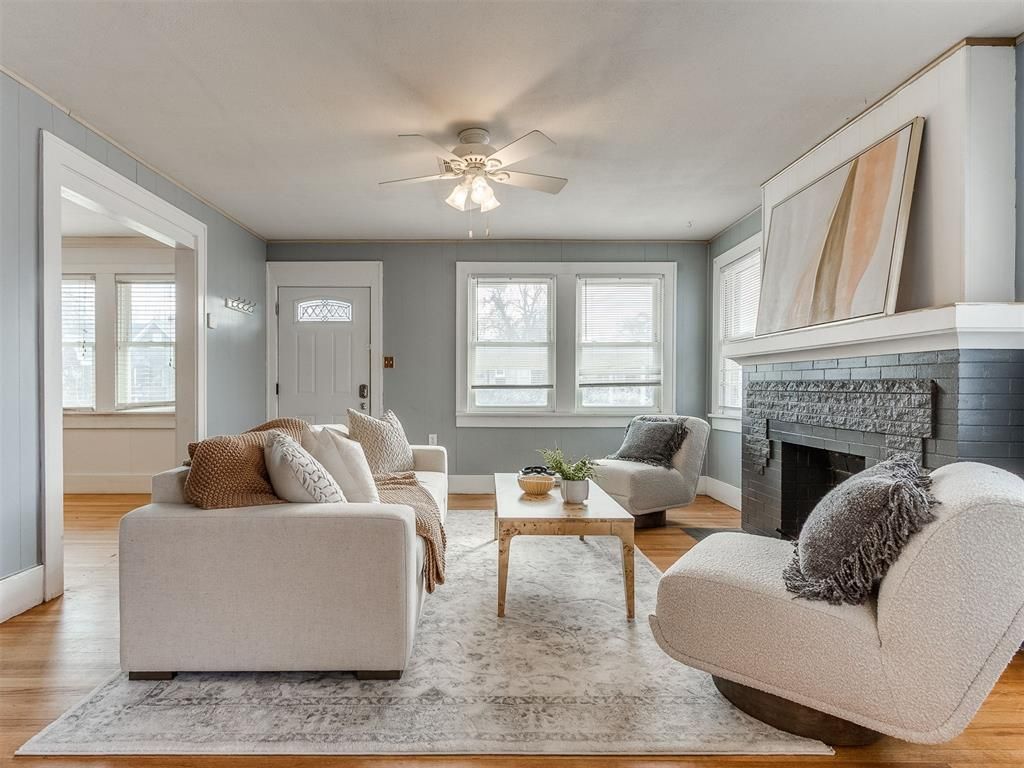 Beautiful home just steps from the Plaza District, this inviting home blends charm, comfort, and thoughtful updates. Warm hardwood floors lead you into a cozy living space centered around a fireplace-perfect for quiet evenings or gathering with loved ones. The updated kitchen features a gas stove, matching appliances, a large pantry, and a warm, functional layout ideal for everyday living. The home offers 3 bedrooms and 2 full bathrooms, including a comfortable primary suite with a spacious walk-in closet that also serves as the home's laundry area. A versatile den or office adds flexible living space. Enjoy peace of mind with a 2020 HVAC system, a roof replaced in November 2019 by a licensed roofer with a 30-year shingle, the comfort of a tankless hot water heater providing endless hot water, and a below-ground storm shelter for added safety. Washer, dryer, and refrigerator are negotiable. Step outside to a spacious backyard ideal for relaxing or entertaining, along with a one-car garage with storage, carport, and additional storage shed. Seller to include solar panels with an acceptable contract. All appliances included including the refrigerator, washer and dryer! This home offers a rare opportunity to enjoy cozy living in one of the city's most beloved, walkable neighborhoods. Ask listing Realtor about the $0 down payment low interest rate loan program with preferred lender!