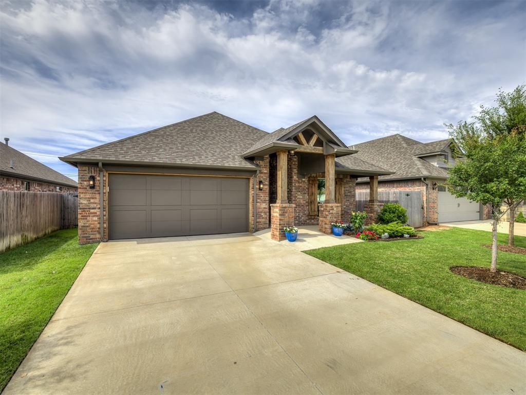 Welcome to the Springs! This gated community offers resort style living with a neighborhood pool, clubhouse, pond and fitness center. Enjoy the low maintenance yard because the HOA covers mowing plus the lawn maintenance including planting your flowers & installing fresh mulch each year. You also get to enjoy the amenities of Valencia including the parks, splash pads, basketball court, walking trails & family fun pools. This beautifully designed 3 bedroom, 2 bathroom house is only several years old. There's lots of natural light thanks to the many large windows. The open floor plan features beautifully stained cabinets. quartz countertops and an island with room for barstool seating. Edmond Schools with OKC utilities is the best of both worlds-IYKYK.