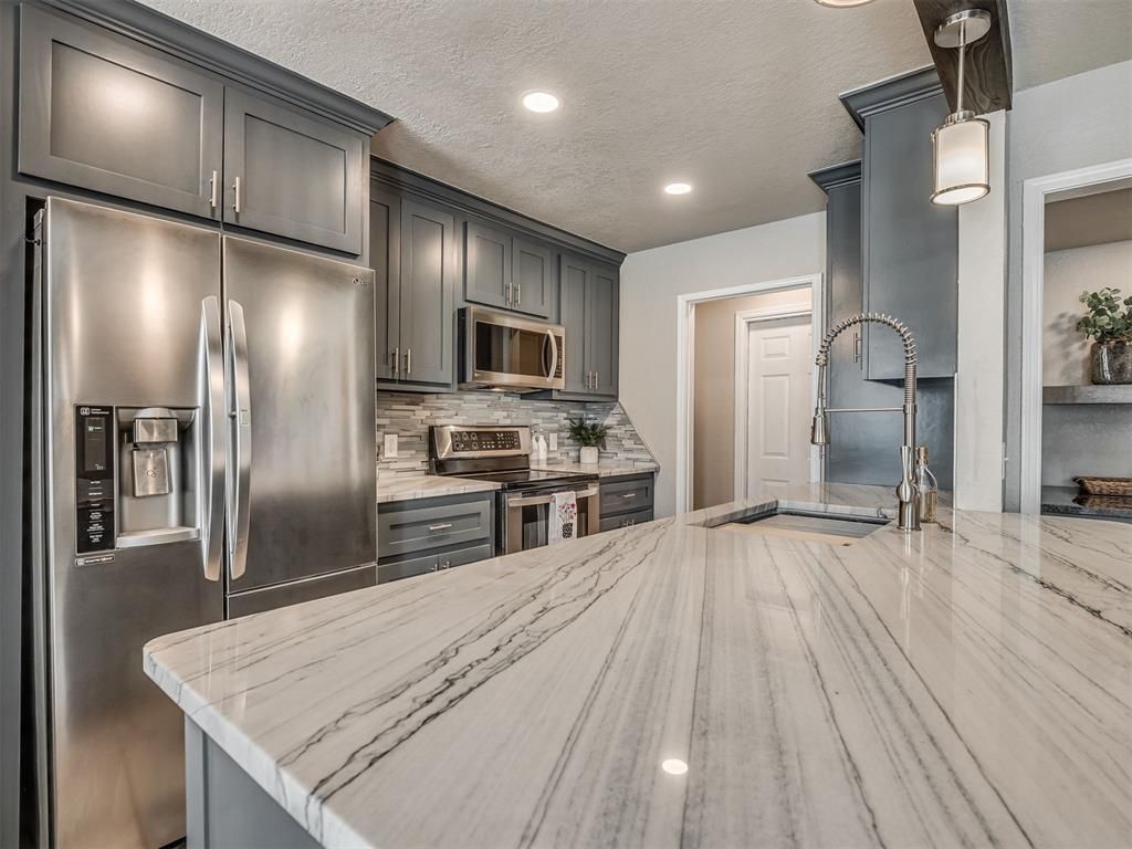 Welcome to this beautifully updated home with an open-concept design, custom wood beam, and a backyard built for entertaining! The kitchen was professionally remodeled, gutted, and opened up, featuring stunning quartz countertops, custom cabinetry, updated sink and fixtures, modern lighting, and a sleek backsplash, all overlooking the main living space and breakfast nook. A fireplace with built-in bookshelves adds a warm focal point. The home also boasts a renovated beverage and coffee bar just off the living space near the breakfast bar. Additional updates throughout include fresh interior and exterior paint, brand new carpet throughout, new toilets and fixtures, new baseboards in the main living areas, recessed lighting throughout, and updated ceiling fans and fixtures. Step into summer like a boss with a fully updated pool featuring resurfacing in 2023, new tile, travertine decking, textured concrete, a new skimmer, and a newer pump motor. Exterior improvements include replaced siding & paint, gutters around the home, and a new spacious storage shed. This flexible floor plan offers 4 bedrooms and 2 bathrooms, or 3 bedrooms plus a study or storage room, with two bedrooms including the primary suite downstairs and two upstairs. Located in Moore schools with Earlywine Elementary! Schedule your private tour today!
