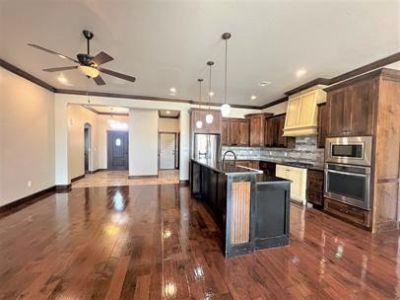 **STORM SHELTER* Beautiful 4 bedroom, 2.5 bath and 3 car garage w/ bonus room above garage. Open floor plan with hardwood flooring, stone fireplace and floor-to-ceiling windows in living area. Chef's kitchen features farmhouse sink, tile backsplash, and granite countertops. Beamed ceilings in the master bedroom with dual sinks, walk-in shower, and jet tub in the master bathroom. Huge bonus room upstairs, can be used as a theater room or additional sleeping space. In-ground storm shelter garage. Covered patio and fully fenced backyard. (Washer and dryer removed) Frigde is negotiable.